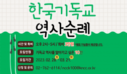 - 한국기독교교회협의회(NCCK) 교육위원회가 주관하는 ‘한국교회 에큐메니칼 아카데미’의 2023년 상반기 강좌가 오는 6월 1일(목) 저녁 7시에 개강합니다. 한국교회 에큐메니칼 아카데미 2023년 상반기 과정은 빠르게 변화하고 있는 현대 사회와 문화 가운데서 복음을 이해할 수 있는 방식으로 전달
