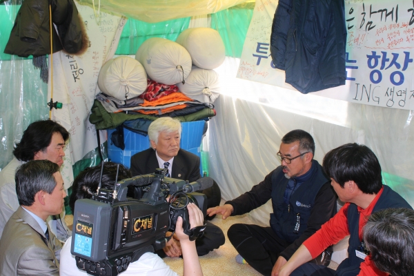 지난 9월 30일(월) 오후 2시, NCCK 김영주 총무는 서울구치소에 수감되어 있는 쌍용자동차 김정우 지부장을 특별 면회하였습니다. 김 지부장과의 만남은 지난 5월 7일 평택공장 앞 송전탑 농성 노동자 방문 때 이후 4개월 만이었습니다. 김영주 총무는 김정우 지부장에게 “얼굴이 예전보다 많이 좋아졌다”는 덕담으로 이야기를 시작하였습니다. 특히 재판 중에 있는 지부장에게 “재판 기록들을 철저하고 꼼꼼히 잘 챙겨보라”고 하면서 “밖의 일은 잠시 접어두고, 재판에 집중하면서 열심히 책도 읽고, 마음을 비우고 자신을 객관화 시켜 사태를 지켜보면 좋은 해법이 떠오를 수도 있을 것이라”고 말하였습니다. 또한, “어쩌면 앞으로도 더 긴 시간을 싸워야 할지 모르는 상황에서 몸과 마음을 잘 추스르고, 재판에 좋은 결과가 있기를 기도하겠다”고 말하였습니다. ![]() ▲ 지난 5월 7일 김영주 총무가 쌍용자동차 평택공장 앞 송전탑 농성 노동자들을 방문했을 때의 김영주 총무와 김정우 지부장 (김영주 총무 오른쪽) 김영주 총무는 “NCCK가 많이 부족하지만 그동안 쌍용자동차 사태 해결을 위해 함께 기도하면서 동행해 왔고, 앞으로도 사태가 해결될 때까지 끝까지 함께 할 것”이라고 하였습니다. 함께 면회에 동석한 정진우 목사(NCCK 인권센터 소장)는 “부디 재판을 잘 준비하길 바라며, 좋은 소식이 있을 것”이라고 격려하면서, “수감되어 있는 동안 몸과 마음을 잘 다스릴 수 있기를 바란다”고 하였습니다.