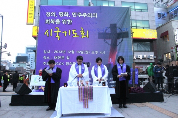 한국기독교교회협의회 정의평화위원회(위원장 허원배 목사)는 "오직 공의를 물 같이, 정의를 하수 같이 흐르게 하라"는 예언자 아모스의 외침을 따라 하나님의 정의를 선포하는 일이 교회의 사회적 책임이자 의무라 고백하며, 불법과 불의, 부정과 거짓에 대항하여 하나님의 정의와 평화를 세우고, 유린당한 민주주의를 회복시키고자 12월 16일(월) 대한문 앞에서 시국기도회를 개최하고, 아래와 같은 선언문을 발표하였습니다.