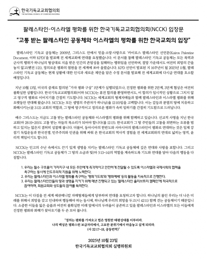 NCCK extends this statement to our ecumenical Sisters and Brothers around the world and requests their solidarity together. Because we are as the body of God, we must hope, persevere, and act for a better future, at the same time, be a community that walks together, placing our hope in God (Psalm 42:11). We pray for true peace and reconciliation for all those in Palestine and Israel, who grieve the loss of loved ones and fear the uncertain future that still exists. "The effect of righteousness will be peace, and the result of righteousness, (Isaiah 32:17~18, NRSV) October 23, 2025 Executive Committee, the National Council of Churches in Korea (NCCK)