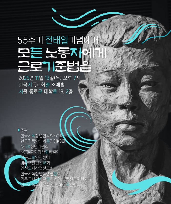 ▪ 제목: 기독청년 전태일 55주기 기념예배 ▪ 주제: 모든 노동자들에게 근로기준법을 ▪ 일시: 2025년 11월 13일(목) 저녁 7시 ▪ 장소: 한국기독교회관 2층 조에홀 ▪ 주관: 한국기독청년협의회(EYCK), 한국기독학생회총연맹(KSCF), 한국기독교교회협의회(NCCK) 청년위원회, 한국기독교교회협의회(NCCK) 교회와사회위원회, 한국교회인권센터, 영등포산업선교회, 인천도시산업선교회, 한국기독청년학생연합회, 기독교사회선교연대회의노동선교위원회, 한국기독교장로회 청년회전국연합회 (10월 24일 기준) * 별첨: 웹자보 |