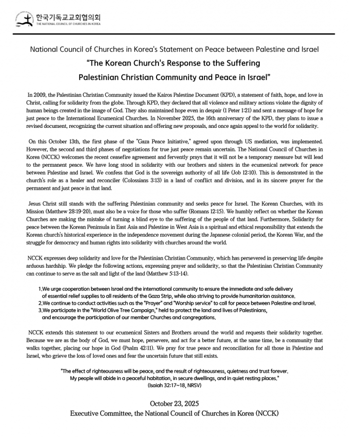 세계 에큐메니칼 공동체는 이러한 현실 속에서 국제사회와 더불어 팔레스타인의 정의와 평화를 위해 연대해 왔습니다. 우리는 특히 2009년 팔레스타인 기독교 공동체가 교파를 넘어 발표한 첫 신앙 문서, ‘카이로스 팔레스타인 선언문’을 기억합니다. 점령 아래 고통받는 팔레스타인 그리스도인들이 세계교회에 보낸 이 예언자적 호소는, 침묵을 멈추고 정의를 위한 행동에 나서 달라는 요청이었습니다. NCCK와 한국교회 역시 이 카이로스의 정신을 따르며 팔레스타인의 아픔에 연대해 왔으며, 이는 한국교회만의 목소리가 아니라 세계 에큐메니칼 공동체가 함께 걸어온 신앙의 여정 속에 놓여 있습니다.