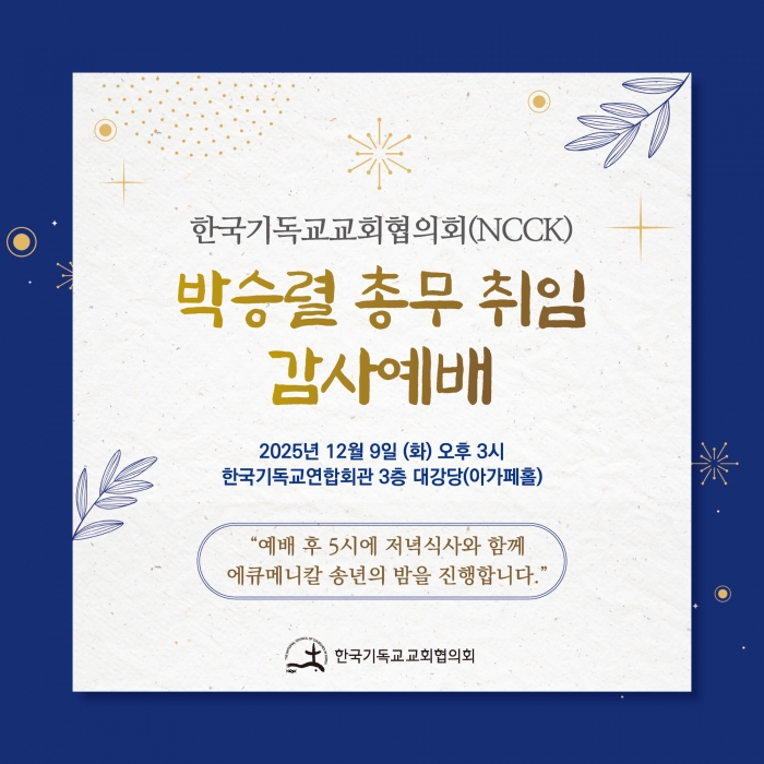 2. 한국기독교교회협의회(NCCK)는 2025년 12월 9일(화) 오후 3시, 한국기독교연합회관 3층 아가페홀(서울 종로구 김상옥로 30)에서 박승렬 목사의 ‘총무 취임 감사 예배’를 드립니다.