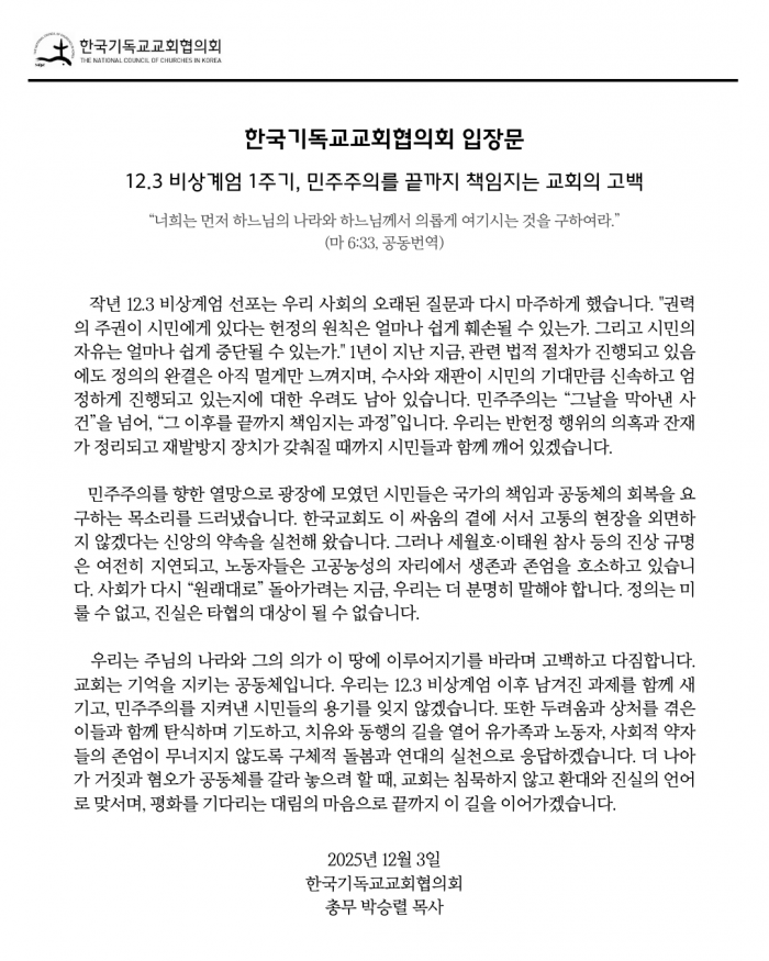 2. 한국기독교교회협의회(NCCK, 박승렬 총무)는 2025년 12월 3일(수), 12.3 비상계엄 사태 1주기를 맞아 아래와 같이 입장문을 발표합니다.