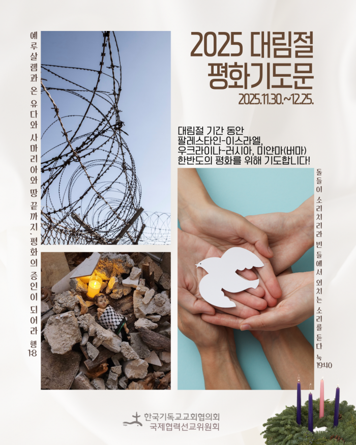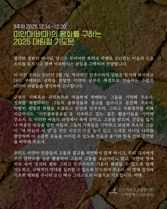 #한국기독교교회협의회 #NCCK #박승렬총무 #NCCK국제협력선교위원회 #에큐메니칼연대 #2025대림절평화기도주간 #대림절평화기도 #대림절 #미얀마민주주의 #평화를위한기도 #미얀마그리스도인 #미얀마군부독재타도 #미얀마시민불복종운동 #정의와평화 #중보기도 #PrayForPeace #PrayForMyanmar #AdventPrayer #PeaceForMyanmar #FreeMyanmar