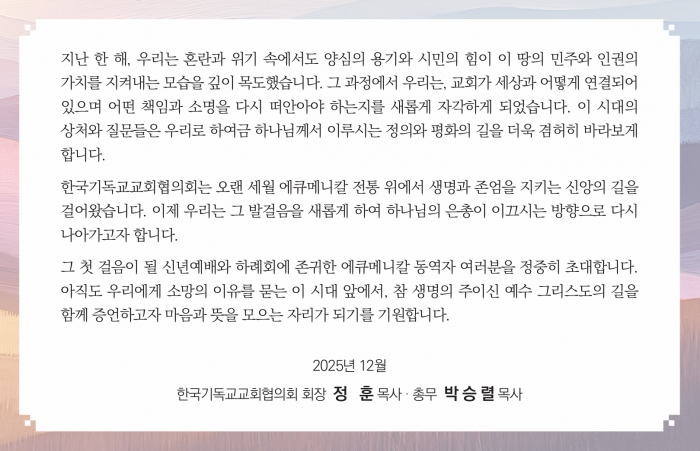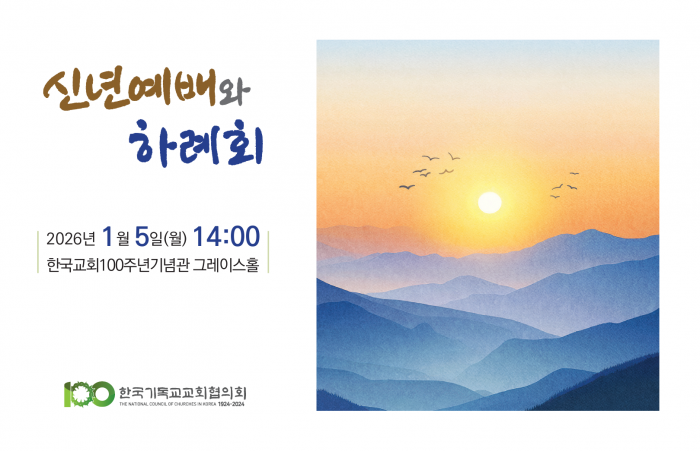 2. 한국기독교교회협의회(NCCK, 회장 정훈 목사·총무 박승렬 목사)는 2026년 새해를 맞아 아래와 같이 신년예배와 하례회를 갖습니다. 예배를 통해 우리가 모든 피조물과 함께 하나님 안에서 연결되어 있음을 고백하고, 새해의 여정을 격려하며 기쁨을 나누고자 합니다.