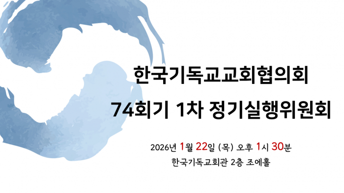 한국기독교교회협의회(NCCK, 회장 정훈 총회장, 총무 박승렬 목사) 74회기 1차 정기실행위원회가 2026년 1월 22일(목) 오후 1시 30분, 한국기독교회관 2층 조에홀에서 열립니다.