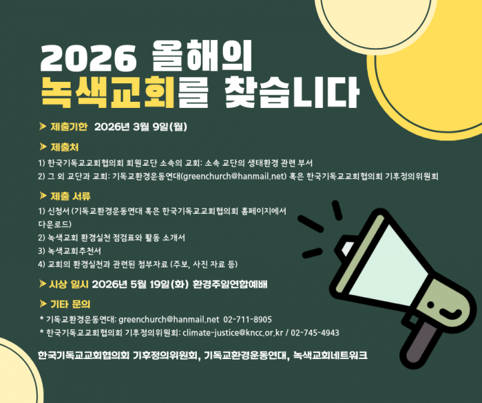 3. 이에 교회협과 기독교환경운동연대는 오는 2026년 2월 6일(금) 오후 2시, 서울 종로구 한국기독교회관 1층 에이레네홀에서 ‘녹색교회 설명회 및 기자회견’을 개최합니다. 이번 기자회견을 통해 2026년 녹색교회 선정 계획을 발표하고, 한국교회가 나아가야 할 생태적 비전인 ‘녹색교회 사업’을 공유하고자 합니다.