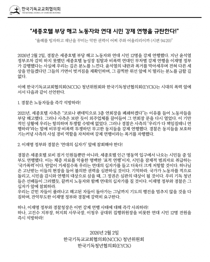 교회협 언론 2026 - 05호 (2026. 02. 02.) 수 신: 각 언론사 발 신: 한국기독교교회협의회(NCCK) 청년위원회, 한국기독청년협의회(EYCK) 제 목: 세종호텔 부당해고 노동자와 연대 시민 강제 연행 규탄 입장문 보도 요청의 건 |