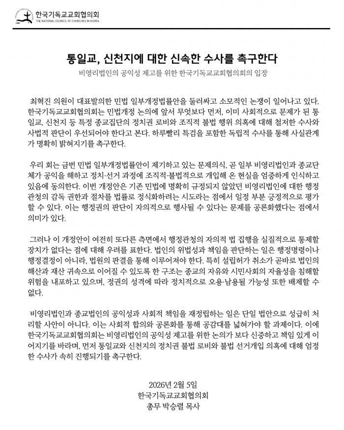 비영리법인과 종교법인의 공익성과 사회적 책임을 재정립하는 일은 단일 법안으로 성급히 처리할 사안이 아니다. 이는 사회적 합의와 공론화를 통해 공감대를 넓혀가야 할 과제이다. 이에 한국기독교교회협의회는 비영리법인의 공익성 제고를 위한 논의가 보다 신중하고 책임 있게 이어지기를 바라며, 먼저 통일교와 신천지의 정치권 불법 로비와 불법 선거개입 의혹에 대해 엄정한 수사가 속히 진행되기를 촉구한다.