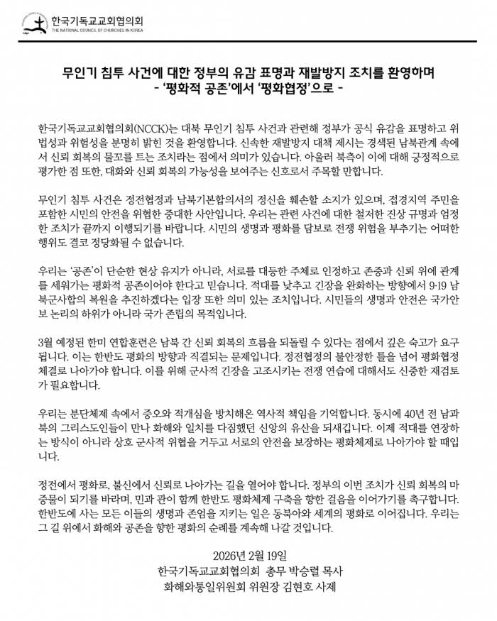 한국기독교교회협의회(NCCK, 박승렬 총무) 화해와통일위원회(김현호 위원장)는 대북 무인기 침투 사건과 관련해 정부가 공식 유감을 표명하고 재발방지 대책을 제시한 것을 환영하는 논평을 발표했습니다. 교회협은 이번 조치가 경색된 남북관계 속에서 신뢰 회복의 물꼬를 트는 계기가 될 수 있다고 평가하며, 북측의 긍정적 반응 또한 대화 재개의 가능성을 보여주는 신호로 주목했습니다.
