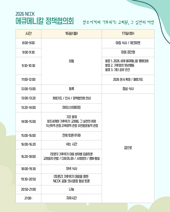2. 한국기독교교회협의회(NCCK, 회장 정훈 목사, 총무 박승렬 목사)는 「창조세계와 기후위기: 교회됨, 그 실천의 여정」을 주제로 2026 NCCK 에큐메니칼 정책협의회를 개최합니다.