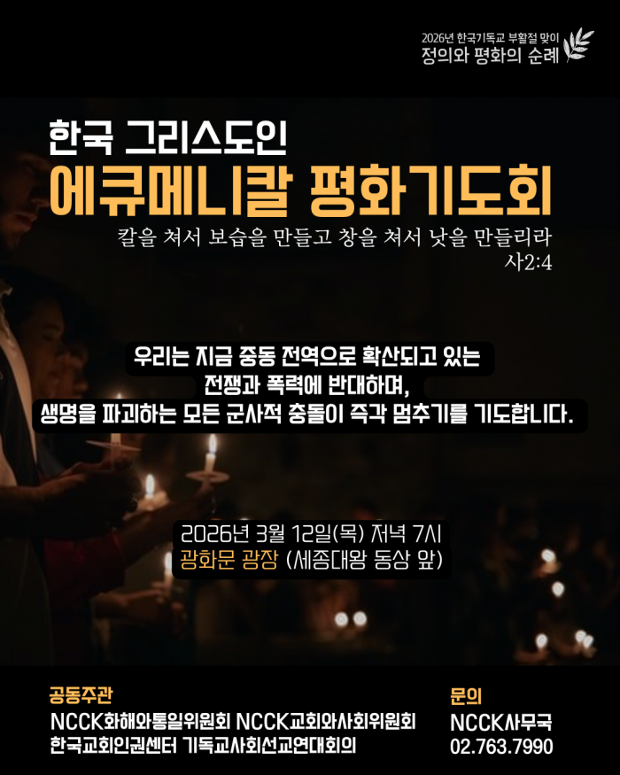 한국기독교교회협의회(NCCK, 총무 박승렬)는 최근 미-이스라엘의 이란 침공을 비롯하여 중동 지역에서 격화되고 있는 전쟁 상황에 깊은 우려를 표하며, 오는 3월 12일(목) 저녁 7시 서울 광화문광장(세종대왕 동상 앞)에서 「한국 그리스도인 에큐메니칼 평화기도회 – 전쟁을 멈추고 생명의 길을 선택하라」를 열고자 합니다.