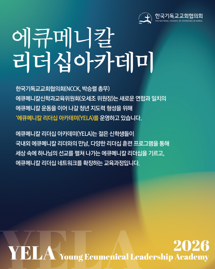 한국기독교교회협의회(NCCK, 총무 박승렬 목사) 에큐메니칼신학과교육위원회(위원장 오세조)는 교회와 사회 속에서 생명·정의·평화의 가치를 함께 실천할 지도력을 기르기 위해 ‘2026년 에큐메니칼 리더십 아카데미(Young Ecumenical Leadership Academy, YELA)’ 2기 참가자를 모집합니다.