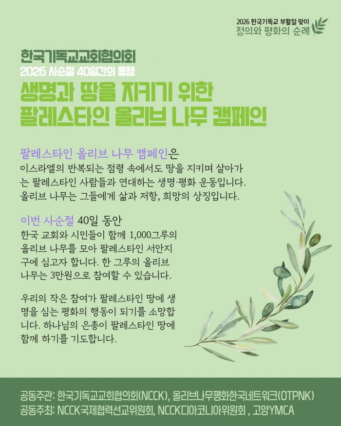 한국기독교교회협의회(NCCK, 총무 박승렬)는 2026년 사순절을 맞아 팔레스타인 농민들과 연대하고 생명과 땅을 지키기 위한 「2026 사순절 40일간의 동행 – 팔레스타인 올리브 나무 캠페인」을 진행합니다. 이번 캠페인은 NCCK 국제협력선교위원회와 디아코니아위원회가 함께 추진하며, 사순절 기간 동안 팔레스타인 서안지구에 올리브 나무 1,000그루를 심는 것을 목표로 합니다.