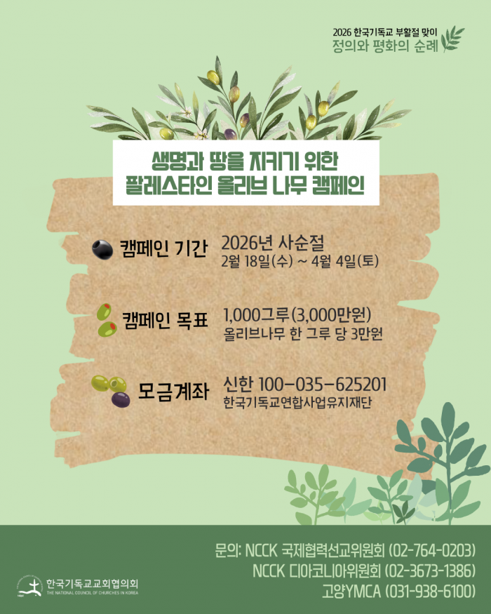 이번 캠페인은 2026년 2월 18일 재의 수요일부터 4월 4일 성토요일까지 사순절 40일 동안 진행되며, 올리브 나무 한 그루당 3만 원의 후원으로 참여할 수 있습니다. NCCK는 한국 교회와 그리스도인들이 사순절 헌금과 기도를 통해 이 평화의 여정에 동참해 줄 것을 요청하며, 우리의 작은 연대가 팔레스타인 땅에 생명을 심는 평화의 행동이 되기를 소망합니다.