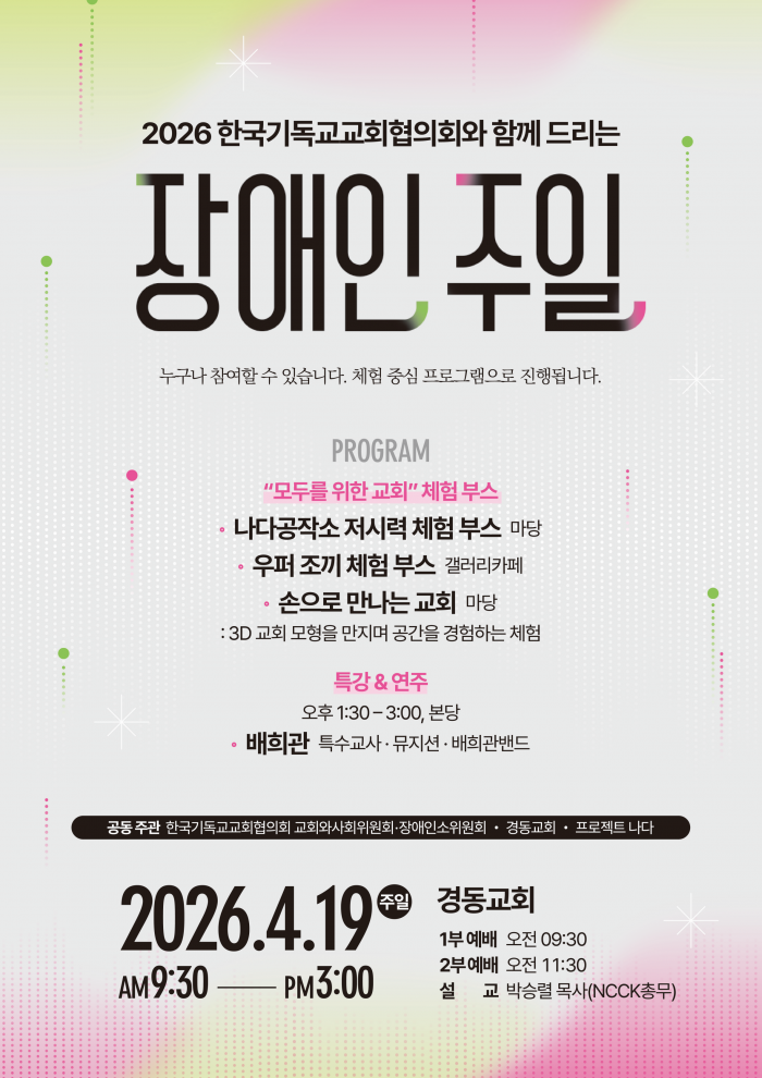 2026년 장애인주일 기념예배는 NCCK 교회와사회위원회(위원장 이재호 목사) 장애인소위원회와 경동교회가 공동으로 주관합니다. 이번 예배에서 박승렬 총무는 “함께 알아보는 부활, 함께 살아내는 공동체”를 주제로 설교할 예정입니다. 예배 이후에는 장애인의 삶과 권리에 대한 이해를 넓히기 위한 장애인 인식개선 체험 부스도 운영됩니다.