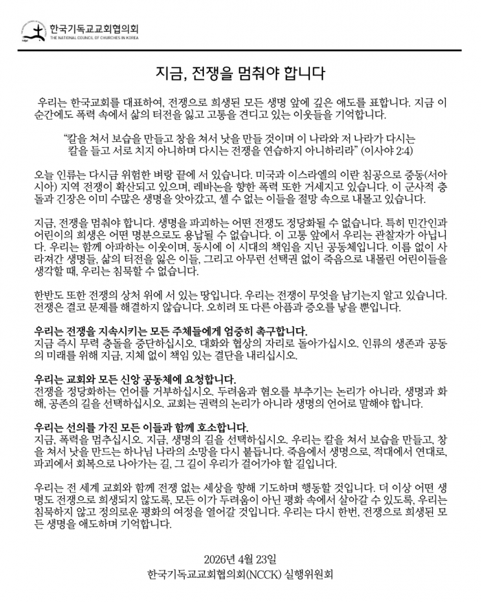 1. 한국기독교교회협의회(NCCK, 총무 박승렬)는 NCCK의 주요 정책과 입장을 결의하는 기구인 실행위원회 명의로 중동 지역 전쟁 확산에 깊은 우려를 표하며 즉각적인 전쟁 중단을 촉구하는 공식 성명을 발표하였습니다.
